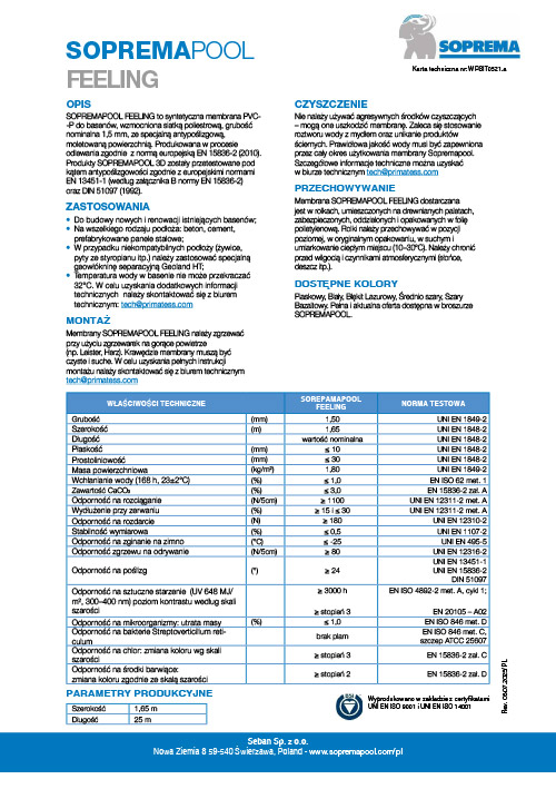 Nowa linia SOPREMAPOOL FEELING. Poczuj ją poprzez dotyk. Membrany o grubości 1,5 mm, jednokolorowe, wzmocnione, przeznaczone do wykańczania niecek basenowych. Dodatkowo posiadają właściwości antypoślizgowe. Membrany są produkowane metodą wylewania i składają się z czterech warstw, pomiędzy którymi – między drugą a trzecią – znajduje się idealnie wycentrowana poliestrowa siatka wzmacniająca.